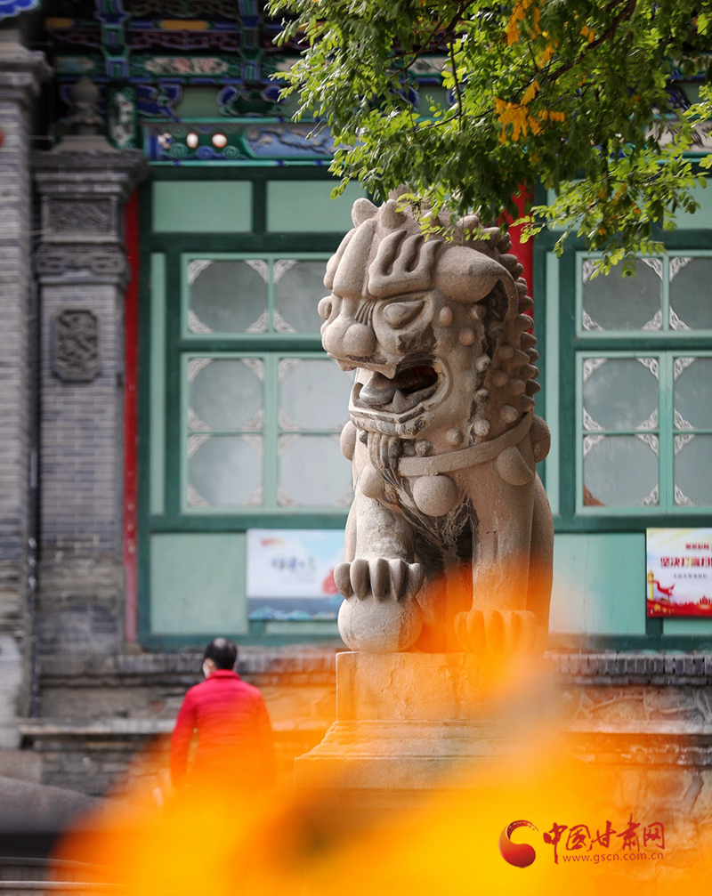 秋天,石獅子和金黃色構(gòu)成五泉山的一道景致。