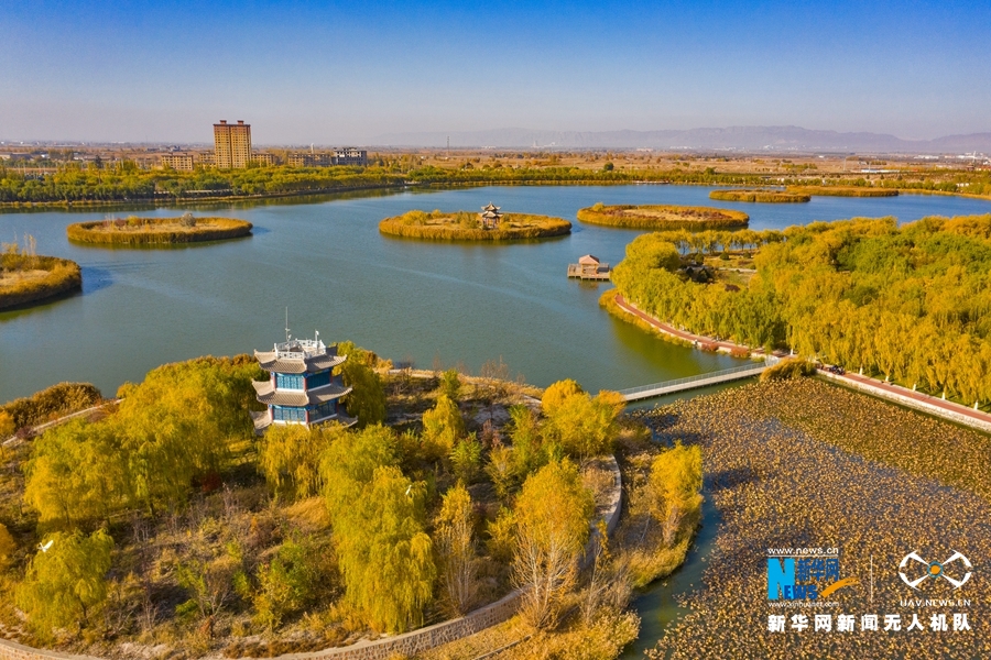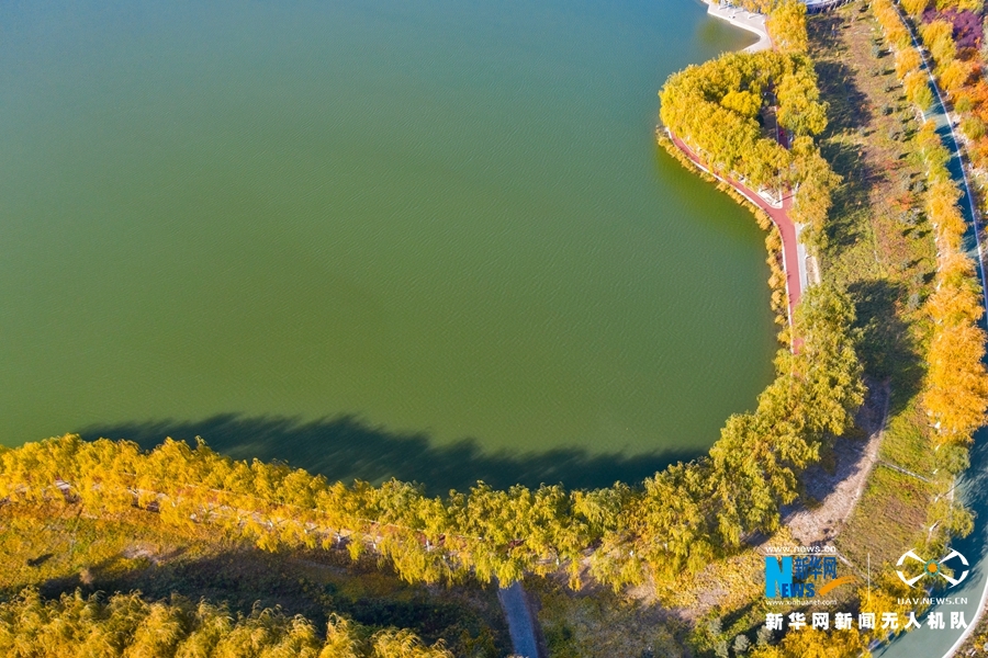 深秋時(shí)節(jié),國(guó)家4A級(jí)景區(qū)甘肅省張掖潤(rùn)泉湖公園秋水依依,草木金黃,呈現(xiàn)出一幅斑斕畫卷。新華網(wǎng)發(fā)(成林 攝)
