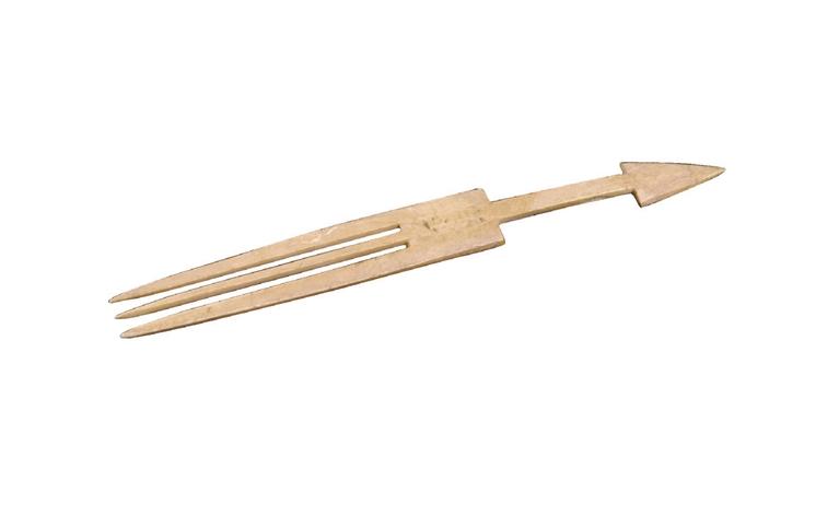 再看一柄骨叉,這柄骨叉同樣是齊家文化時(shí)期的產(chǎn)物,距今有4000年之久了,若不是文物標(biāo)明年代,真不敢相信它是數(shù)千年前的先民所制。這柄骨叉長(zhǎng)15.8厘米、寬1.8厘米、厚0.2厘米,叉部呈長(zhǎng)方形,尖端為三齒,細(xì)長(zhǎng)方形柄,柄端呈三角形。去掉柄端的三角造型,這柄骨叉與現(xiàn)在餐桌上的叉子有什么分別呢?最難得的是,這柄骨叉制作得如此規(guī)整,打磨得這般光滑,想想看,它可是新石器時(shí)代先民的手工活,制作竟如此精美,真令人嘆服!