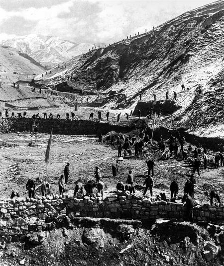 當(dāng)年莊浪縣鄭河公社上寨村村民大修梯田的場景。