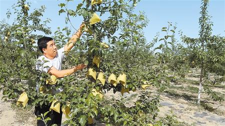 下午時分,在朱店鎮(zhèn)南部山區(qū)萬畝產(chǎn)業(yè)示范基地里,果農(nóng)朱讀強正在自己的果園里忙碌著。他身后的15畝梯田果園里,蘋果樹已經(jīng)套袋結(jié)束。