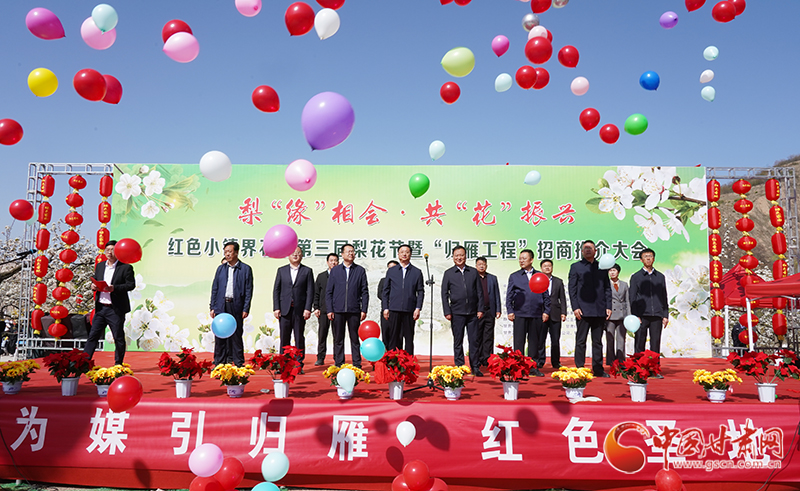 中國甘肅網(wǎng)4月21日訊(本網(wǎng)記者 李紅軍 通訊員 任建祥  馬麗麗)4月20日,平?jīng)鍪徐o寧縣界石鋪鎮(zhèn)李堡村彩旗飄飄、人頭攢動。界石鋪鎮(zhèn)第三屆“梨‘緣’相會·共‘花’振興”梨花節(jié)暨“歸雁工程”招商推介會在這里舉行,各界人士集聚梨園賞花游春,共商鄉(xiāng)村振興發(fā)展之計。