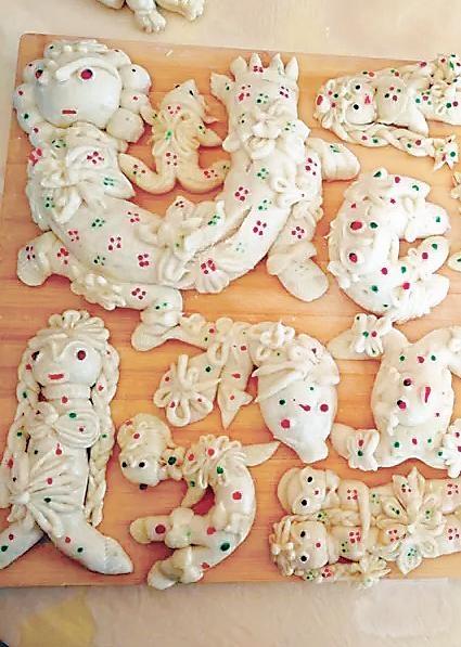 靜寧人的花饃饃,正是應(yīng)和了消病消災(zāi)、祈求平安的民間心理。端午禮儀中的面塑,表達(dá)著人們對(duì)美好事物的向往和祈禱。雖然是以食物的面目出現(xiàn),但那些充滿靈性的造型,卻飽含著人文的意蘊(yùn)。靜寧人塑成動(dòng)物的面花中,最多的是蟾蜍和蛇。蛇面花多是盤成一團(tuán)的,沒(méi)有攻擊性又溫和的樣子。蟾蜍面花本地人叫“癩呱子”,形象很可愛(ài),多的是兩只后足弧形對(duì)稱,蜷在腹部?jī)蓚?cè);兩只前足在頭頂相合,呈環(huán)抱姿態(tài)。也有別出心裁的婦女,會(huì)做出十二生肖之類的面花,這些面花,修飾并不夸張,其神韻更勝于外在的精致技巧。所有的端午面花都寄寓著大人們的祈福,但孩子們最喜歡的是動(dòng)物面花,古靈精怪的,讓他們舍不得摸,更舍不得吃,只能與荷包一起掛在胸前賞玩,或與鄰家的小孩子一起比,看誰(shuí)的媽媽手更靈更巧。