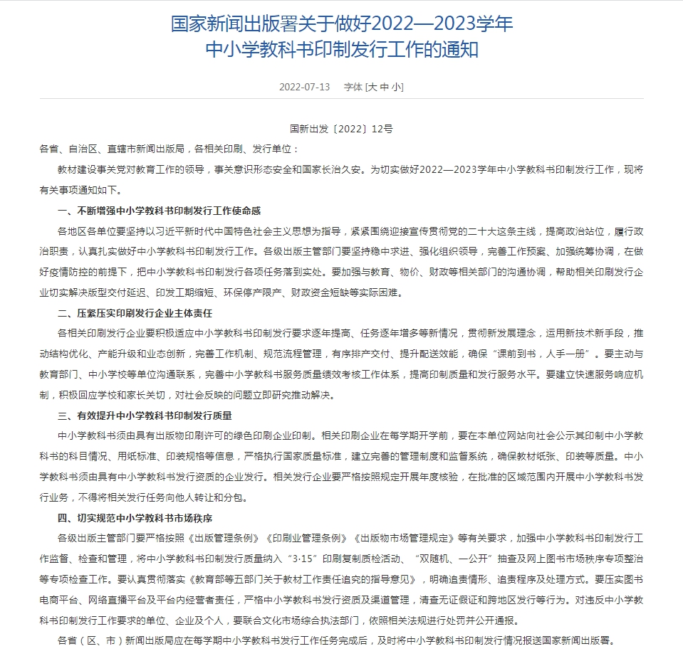 13日,國家新聞出版署網(wǎng)站發(fā)布《國家新聞出版署關(guān)于做好2022—2023學(xué)年中小學(xué)教科書印制發(fā)行工作的通知》(以下簡稱《通知》)。其中強(qiáng)調(diào),各相關(guān)印刷發(fā)行企業(yè)要積極適應(yīng)中小學(xué)教科書印制發(fā)行要求逐年提高、任務(wù)逐年增多等新情況?!锻ㄖ返淖詈蟊硎荆袑?shí)規(guī)范中小學(xué)教科書市場秩序。