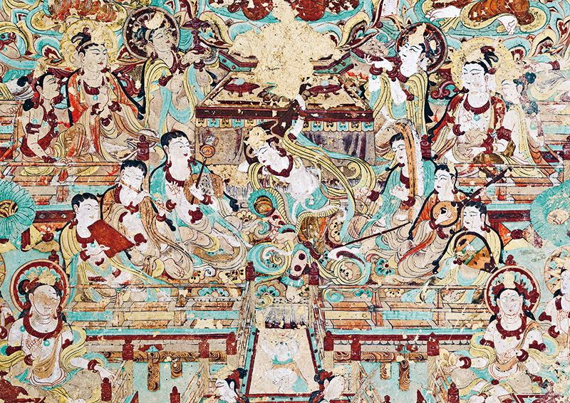 敦煌文化延續(xù)近兩千年,是世界現(xiàn)存規(guī)模最大、延續(xù)時(shí)間最長(zhǎng)、內(nèi)容最豐富、保存最完整的藝術(shù)寶庫(kù),是世界文明長(zhǎng)河中的一顆璀璨明珠,也是研究我國(guó)古代各民族政治、經(jīng)濟(jì)、軍事、文化、藝術(shù)的珍貴史料。圖為莫高窟第112窟南壁壁畫“反彈琵琶樂(lè)舞圖”?!《鼗脱芯吭汗﹫D