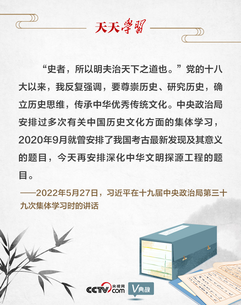 為深入了解中華文明五千多年發(fā)展史,推動把中國文明歷史研究引向深入,推動全黨全社會增強歷史自覺、堅定文化自信,2022年5月27日,十九屆中央政治局就深化中華文明探源工程進行第三十九次集體學習。習近平總書記引用古語“史者,所以明夫治天下之道也”,強調(diào)要尊崇歷史、研究歷史,確立歷史思維,傳承中華優(yōu)秀傳統(tǒng)文化。