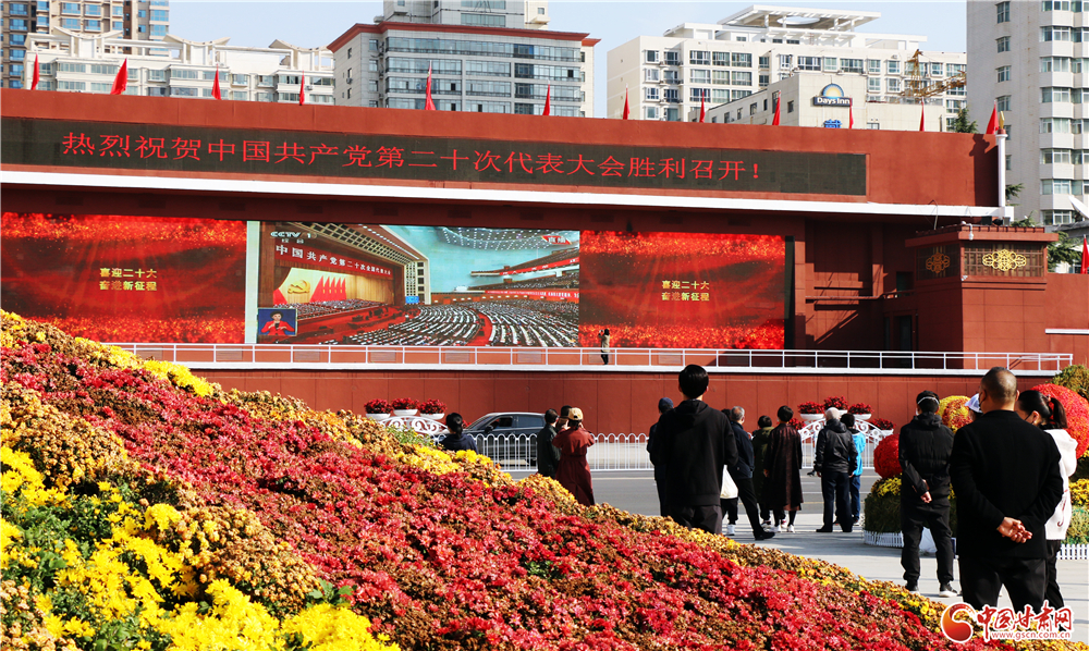蘭州市東方紅廣場(chǎng),許多市民駐足路邊,通過大屏幕收看中國(guó)共產(chǎn)黨第二十次全國(guó)代表大會(huì)盛況。