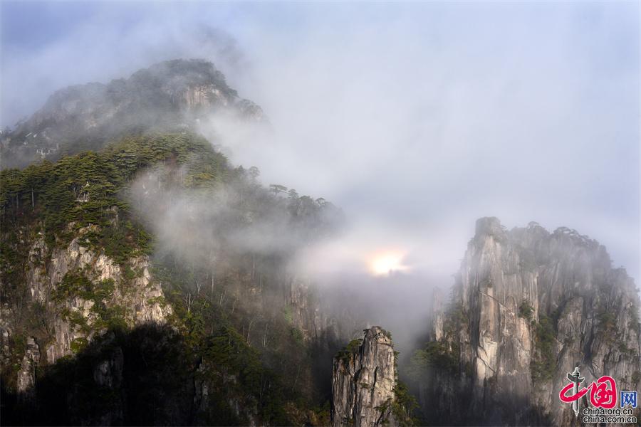 在黃山風(fēng)景區(qū)的始信峰,群峰中時而云海翻騰,時而霧靄朦朧,時而艷陽高照,還出現(xiàn)了佛光奇觀,勾勒出一幅幅黃山獨有的勝景。