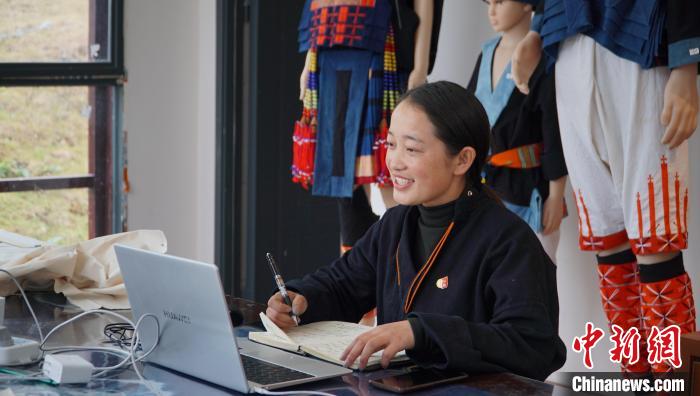 在朵努社區(qū)的織繡坊內(nèi),26歲的白褲瑤居民黎秋憶正在電腦前繪聲繪色地演講。此時(shí)的她正作為瑤族服飾非遺傳承人,參加廣西全區(qū)青年創(chuàng)業(yè)創(chuàng)新大賽。
