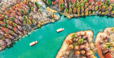 近年來(lái),江蘇省宿遷市宿豫區(qū)大力發(fā)展“農(nóng)旅+產(chǎn)業(yè)+文化”鄉(xiāng)村旅游,圖為宿豫區(qū)新莊彬荷園濕地里,五彩斑斕、錯(cuò)落有致的紅杉樹與清澈碧綠的河水相互映襯,猶如一幅色彩艷麗的“杉”水畫。陳紅 攝(人民圖片)
