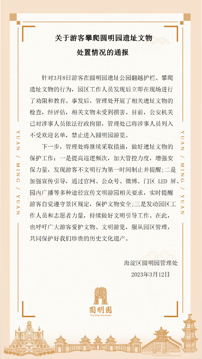 《通報(bào)》指出,針對3月8日游客在圓明園遺址公園翻越護(hù)欄、攀爬遺址文物的行為,園區(qū)工作人員發(fā)現(xiàn)后立即在現(xiàn)場進(jìn)行了勸阻和教育。事發(fā)后,管理處開展了相關(guān)遺址文物的檢查,經(jīng)評估,相關(guān)文物未受到損害。目前,公安機(jī)關(guān)已對涉事人員依法行政拘留,管理處已將涉事人員列入不受歡迎名單,禁止進(jìn)入圓明園游覽。