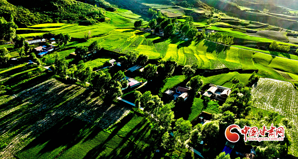 夕陽(yáng)映襯下的祁連山北民樂(lè)縣豐樂(lè)鎮(zhèn)易家灣村,綠油油的莊稼生長(zhǎng)旺盛,林木蓊郁層林盡翠,呈現(xiàn)出生機(jī)勃勃的景象,猶如“巨幅綠毯”。