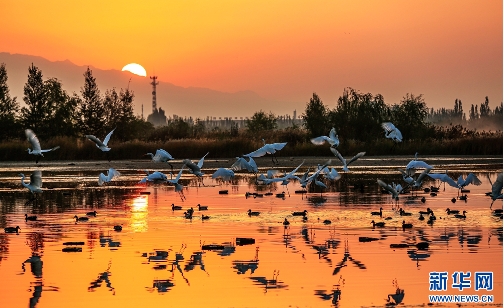 近日,在甘肅省張掖國家濕地公園,成群的白鷺迎著朝陽悠然自得地飛翔、覓食、嬉戲,構(gòu)成了一幅朝陽伴鷺飛的美麗畫卷。新華網(wǎng)發(fā)(陳禮 攝)