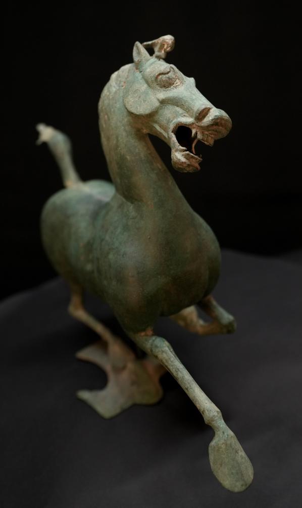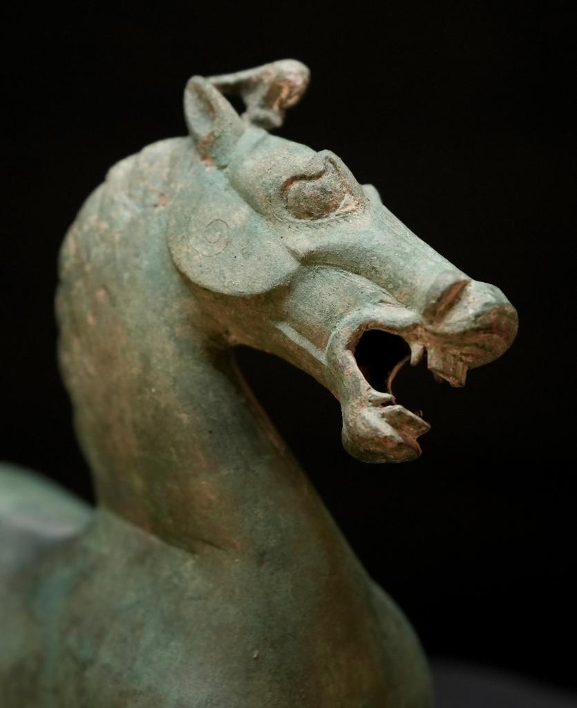 馬兒如在空中飛馳,一足踏上飛鳥的剎那,飛鳥回首驚顧。細(xì)細(xì)觀之,馬的口、眼、鼻均張開,鬃毛和尾絲后揚,令人仿若聽見馬兒奔騰的嘶鳴和風(fēng)嘯聲,靜態(tài)的青銅器充滿靈動之感。
