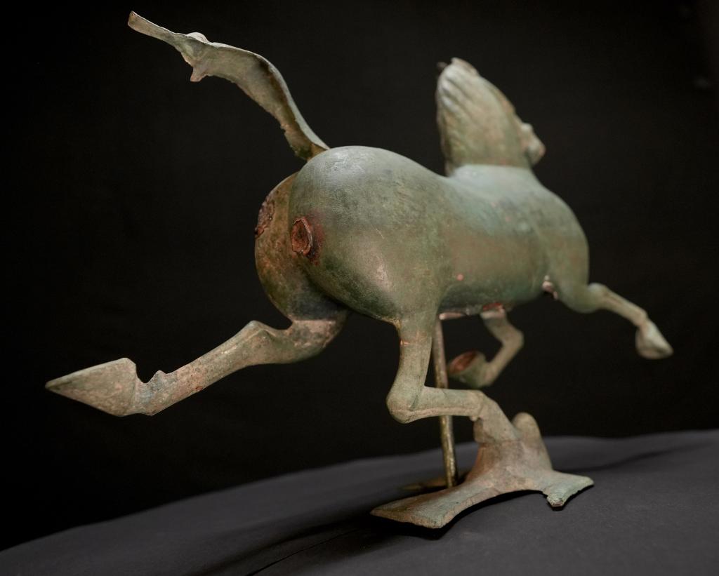 銅奔馬馬身著力點集中于超躡飛鳥的一足之上,既表現(xiàn)了奔馬騰躍于飛鳥之上時風(fēng)馳電掣般的速度,又巧妙地利用飛鳥的軀體以及展開的雙翅,擴(kuò)大了著地面積,穩(wěn)定了重心,其造型完全符合現(xiàn)代力學(xué)的平衡原理。