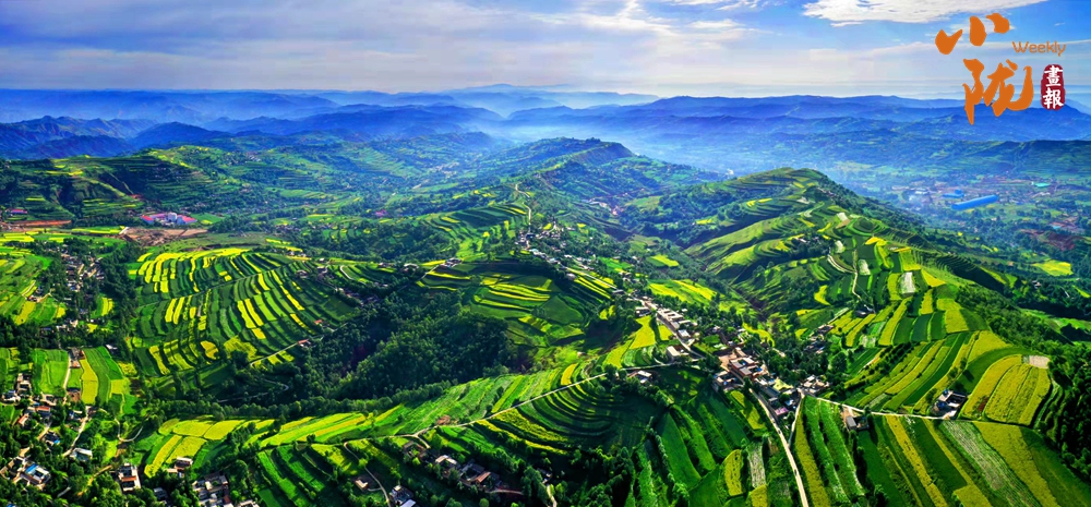 一塊塊梯田,從山峁到山腳,依次而下,大大小小,一層層、一片片,遠(yuǎn)遠(yuǎn)望去,千層萬(wàn)疊,一片紛繁。蔥綠與明黃裝扮的沃野,是季節(jié)的舞衣,也是莊戶人的希望。