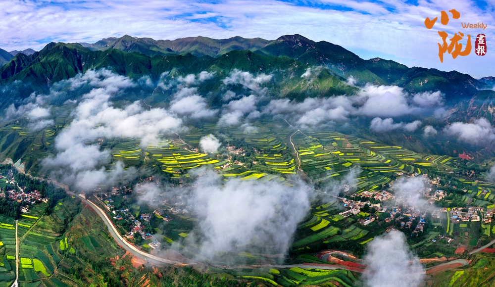 在旅游大通道積石山段遠(yuǎn)眺,云霧穿山飄過(guò),遠(yuǎn)處的村莊和梯田時(shí)隱時(shí)現(xiàn),遠(yuǎn)山近嶺,草樹(shù)煙村......置身其中,仿佛步入了人間仙境。
