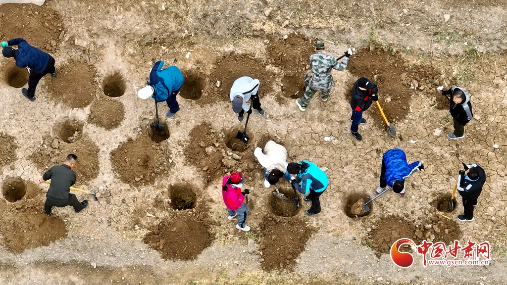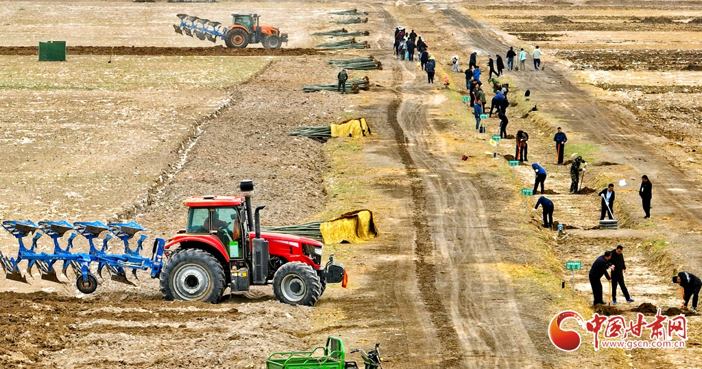 4月9日,甘肅省張掖市甘州區(qū)三閘鎮(zhèn)高寨村義務(wù)植樹基地上,千名當(dāng)?shù)馗刹柯毠ず椭驹刚邆儞]鍬鏟土挖樹坑,掀起農(nóng)田防護林建設(shè)和防沙治沙春季植樹造林熱潮。