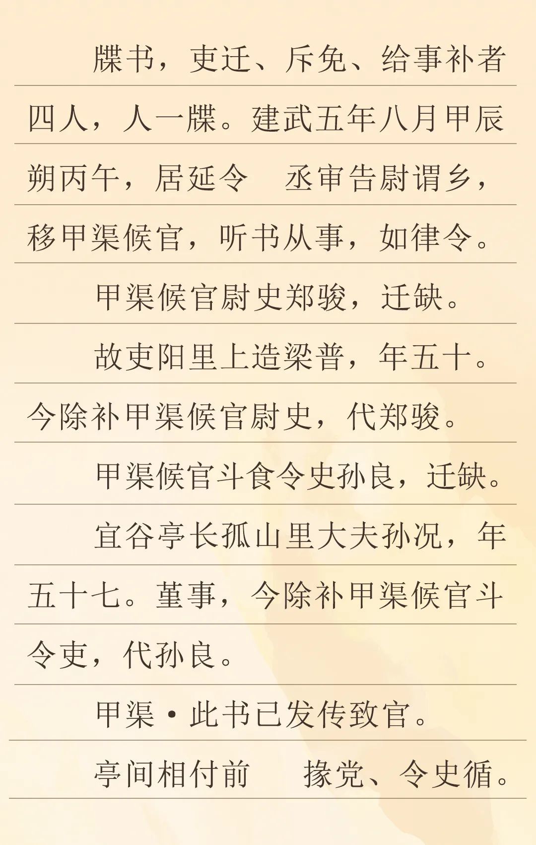 這是一份距今1995年的地方官員任命書。當(dāng)時(shí)是東漢建武五年八月,在漢代張掖郡居延邊塞的甲渠候官進(jìn)行了人事調(diào)整,對官吏進(jìn)行了任免。一個(gè)是甲渠候官尉史鄭駿升遷,由五十歲的梁普補(bǔ)缺;另一個(gè)是甲渠候官斗食令史孫良升遷,由五十七歲的原宜谷亭長孫況代任,其中提到孫況做人低調(diào)、行事嚴(yán)謹(jǐn)(即“謹(jǐn)事”)。這次人事調(diào)整是由居延縣負(fù)責(zé)。