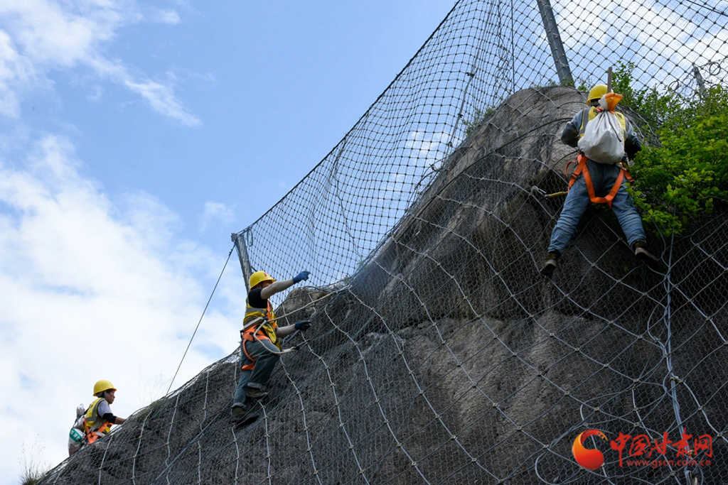 近日,隴海鐵路魏家磨1號隧道上方的山體上,蘭州鐵路局定西工務(wù)段新陽鎮(zhèn)橋路養(yǎng)修工區(qū)的作業(yè)人員,一手抓安全繩,一手拿檢查錘,攀附在懸崖峭壁上仔細(xì)排查防護(hù)網(wǎng)內(nèi)危石情況,及時消除落石隱患。