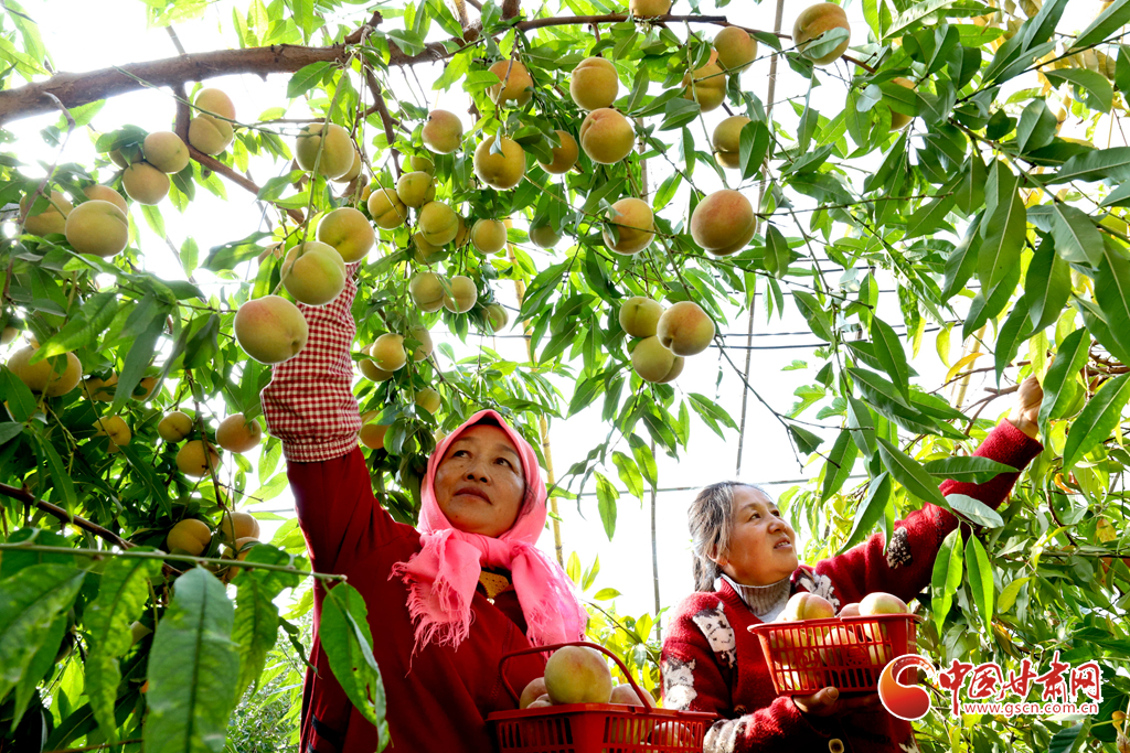 10月24日,在張掖市甘州區(qū)長(zhǎng)安鎮(zhèn)萬(wàn)通果蔬種植專(zhuān)業(yè)合作社“甘泉雪桃”種植基地大棚內(nèi),種植戶正在為甘肅蘭州和青海西寧的客戶采摘裝運(yùn)“甘泉雪桃”。