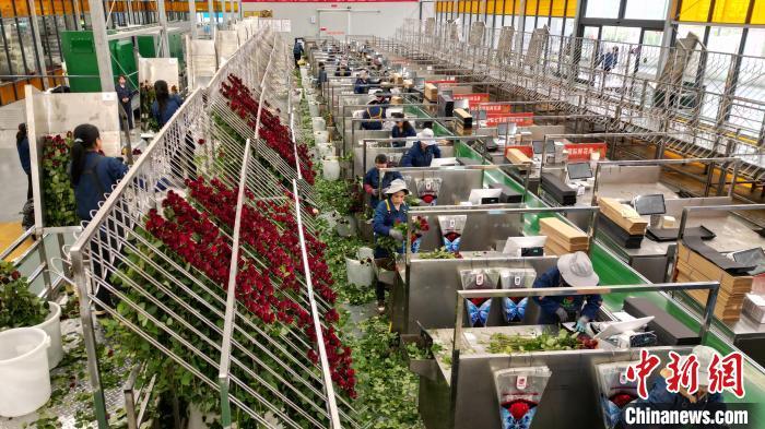 近年來,當(dāng)?shù)靥岢?ldquo;打造魅力花都、建設(shè)公園城市”,聚焦“浪漫經(jīng)濟(jì)”,大力發(fā)展鮮切花產(chǎn)業(yè)。交通便利、人力資源富集是吸引這座“超級玫瑰工廠”國際鮮花港落戶臨夏的主因。