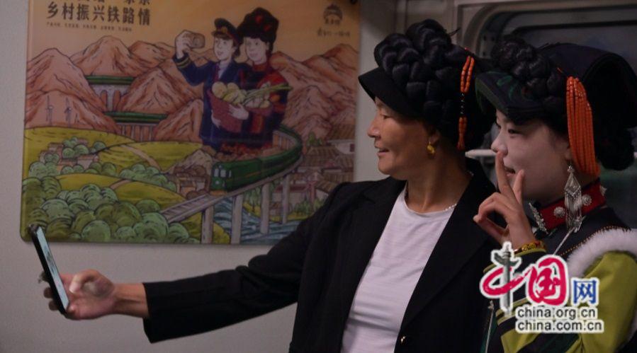 沿途,每當列車??吭谲囌镜却臅r間,彝族老鄉(xiāng)在鐵路工作人員的協(xié)同配合下搬起水果,牽起牛羊,抱起雞鴨放進一節(jié)節(jié)行李車廂上,慢火車的貨架上擺滿了農(nóng)產(chǎn)品。車廂里,人們互相交談,圍坐在一起放聲歌唱,好不熱鬧,歡樂的聲音從車廂內傳出,像是在向廣袤的山川大地宣告著彝歷新年的盛事。
