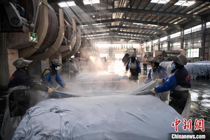11月22日,甘肅省臨夏回族自治州廣河縣一家皮革企業(yè)的生產(chǎn)車間內(nèi),工作人員整理鞣制后的牛皮。九美旦增 攝