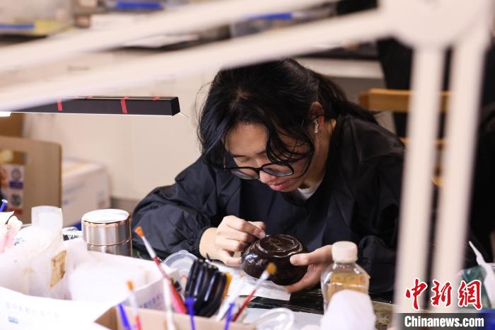 11月27日,南昌漢代?;韬顕z址博物館的漆器修復(fù)室內(nèi),文物修復(fù)師正在修復(fù)一件漆器?!⑺紓?nbsp;攝