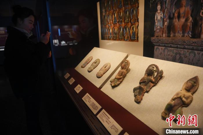 11月28日,甘肅省敦煌市,敦煌研究院敦煌石窟文物保護(hù)研究陳列中心,游客拍攝《披沙揀金——敦煌研究院館藏文物擷英展》。該展由敦煌研究院主辦,2024年下半年煥新布展,展出了不同類型館藏文物,通過這些文物蘊(yùn)含的豐富歷史信息,展現(xiàn)了敦煌文化的多元與包容,勾勒不同文明偕行共進(jìn)的歷史脈絡(luò)。中新社記者 李亞龍 攝