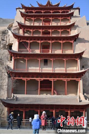 1月13日,甘肅敦煌莫高窟景區(qū)內(nèi),游人在莫高窟標(biāo)志性建筑九層樓前拍照打卡。據(jù)了解,從2024年12月1日至2025年2月28日,當(dāng)?shù)伉Q沙山月牙泉、玉門(mén)關(guān)、敦煌雅丹世界地質(zhì)公園等景區(qū)對(duì)國(guó)內(nèi)外所有游客免門(mén)票,莫高窟門(mén)票實(shí)行半價(jià)優(yōu)惠,開(kāi)放洞窟由8個(gè)增加至10個(gè),為游客提供了更為豐富的觀賞內(nèi)容。中新社記者 李亞龍 攝