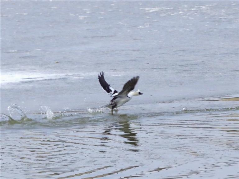 斑頭秋沙鴨是我國(guó)“三有”保護(hù)動(dòng)物,它還有一個(gè)萌萌的名字,叫“熊貓鴨”。瞧,它那黑白相間的羽毛,眼睛周?chē)托茇堃粯?,像戴了一副墨鏡,時(shí)而潛入水下追捕魚(yú)兒,時(shí)而與同伴嬉戲,時(shí)而振翅飛翔,可愛(ài)活潑的模樣在水面上格外顯眼。