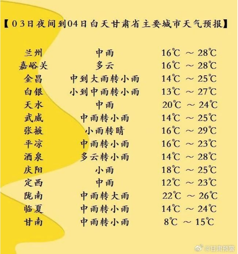 今天夜間到明天白天(7月3日20時-7月4日20時),酒泉、嘉峪關(guān)、張掖三市多云間陰,局部地方有小雨,祁連山區(qū)有中到大雨;省內(nèi)其余地方陰有小到中雨,其中隴南、天水、平?jīng)觥c陽等市局部地方及定西、甘南兩市州東部、白銀市南部有暴雨。