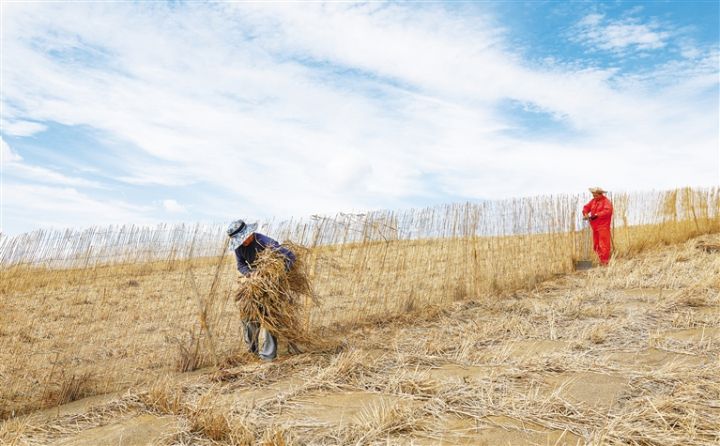 近日,在金塔縣黑河中游防沙治沙林草綜合治理項目固沙現(xiàn)場,工人在起伏的沙丘上或鋪設草方格沙障,或搭建高立式沙障,努力為沙漠邊緣的綠洲、城市筑起屏障。