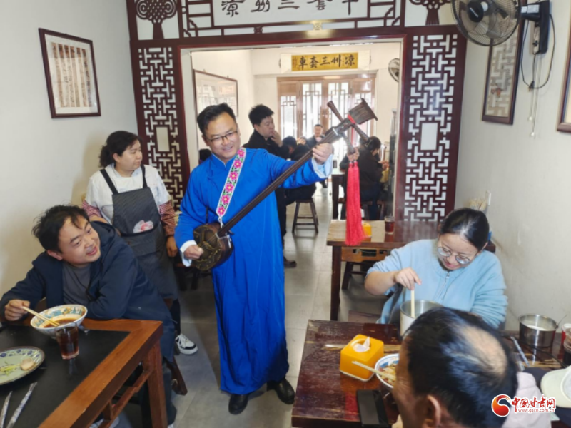 當(dāng)日,北關(guān)市場內(nèi)人流如注、熙熙攘攘,眾多游客與市民齊聚于此,享受美味的同時觀看涼州賢孝和永昌滾燈,涼州賢孝傳承人賈旭峰與用餐的游客進(jìn)行了互動,人們安逸地享受著這份獨具涼州特色的煙火美味。